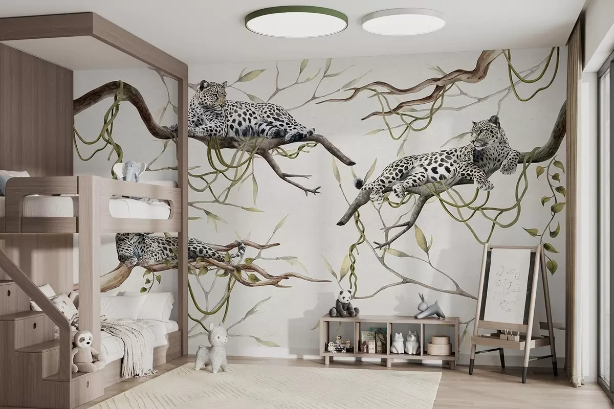Fototapet Leoparzi pe copaci junglă, liane, tropicale, animale sălbatice, paletă de culori pastel Nr. w03146v4