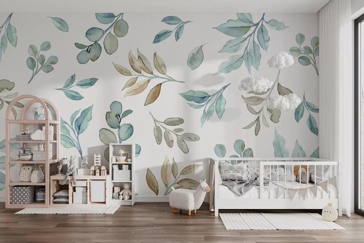 Fototapet diverse frunze și ramuri în tehnica acuarelei în tonuri de albastru și bej pe un fundal alb Nr. w03280