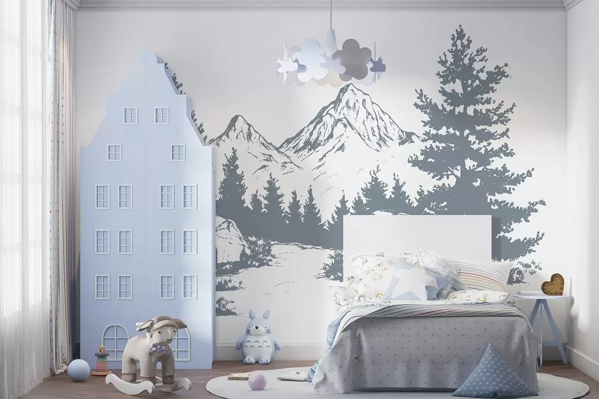 Fototapet Alpi, munți cu pădure, desen liniar, culoare gri Nr. w03342v2