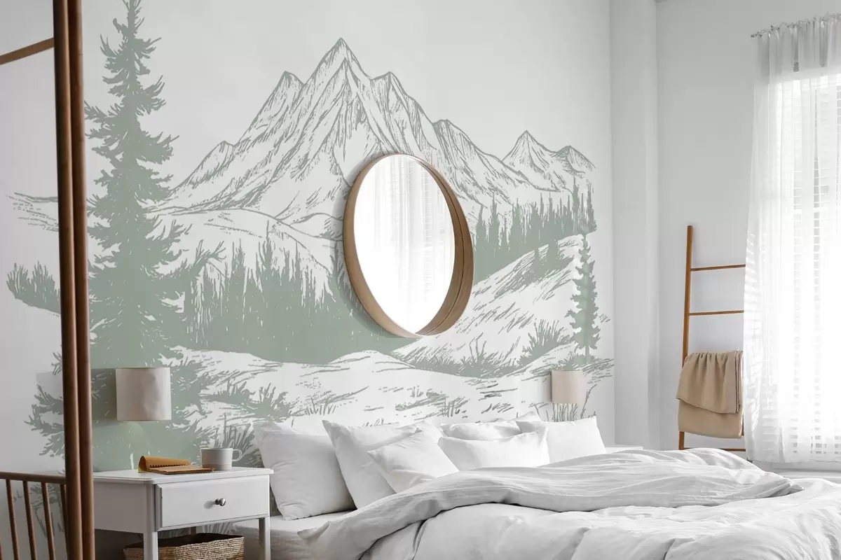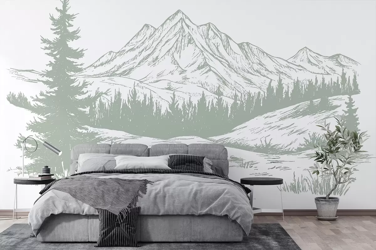 Fototapet Munți peisaj cu copaci de pin, pădure, natură, culoare verde moale Nr. w03344v1