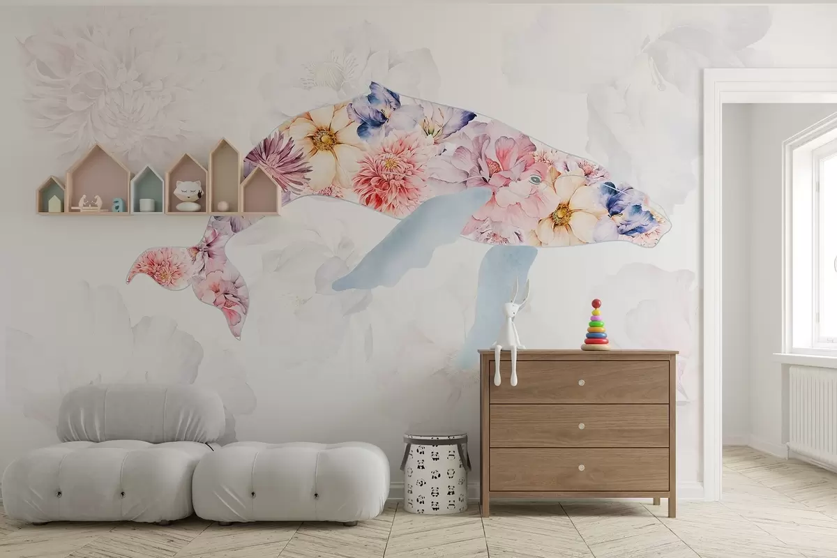 Fototapet Balenă cu flori de acuarelă, animale oceanice, minimalism, colorat Nr. w03446
