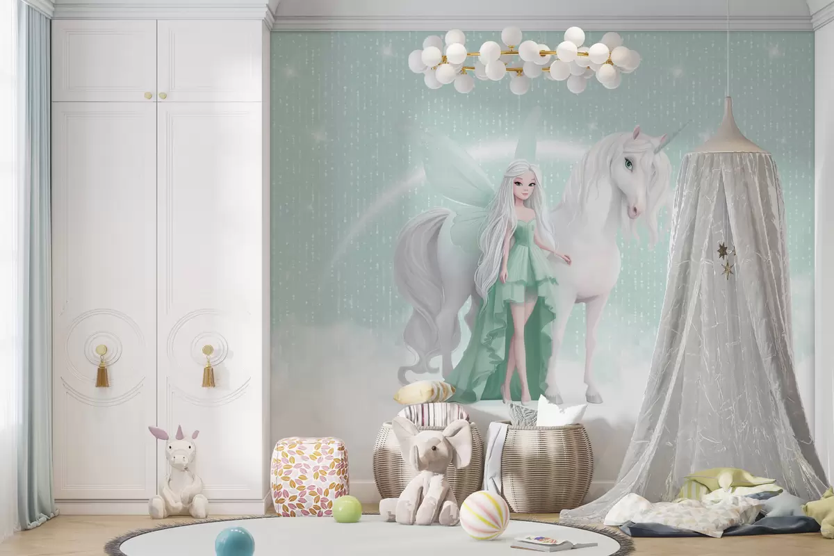 Fototapet O zână cu un unicorn printre nori Nr. w03527v2
