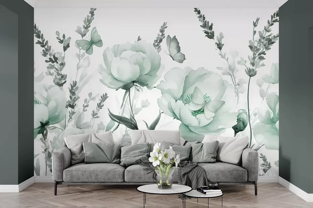 Fototapet Pajiște de flori, bujori, lavandă, fluturi, stil acuarelă, culori verzi Nr. w03668v1