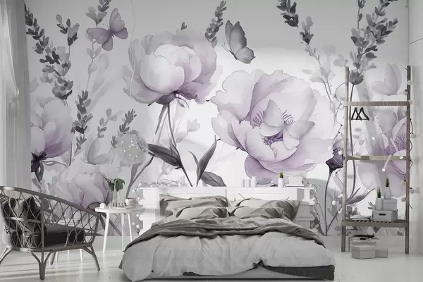 Fototapet Pajiște de flori, bujori, lavandă, fluturi, stil acuarelă, culori puple Nr. w03668v3