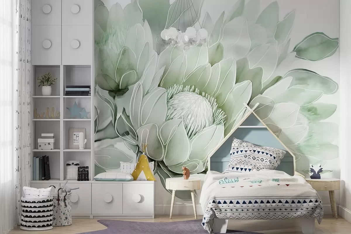Fototapet Frumoase flori protea, linie de arta desen, tropicale, culori verzi Nr. w03669v2