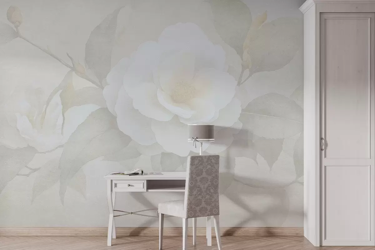 Fototapet Pastel moale cu flori de camelie pe ramură, culori bej Nr. w03760