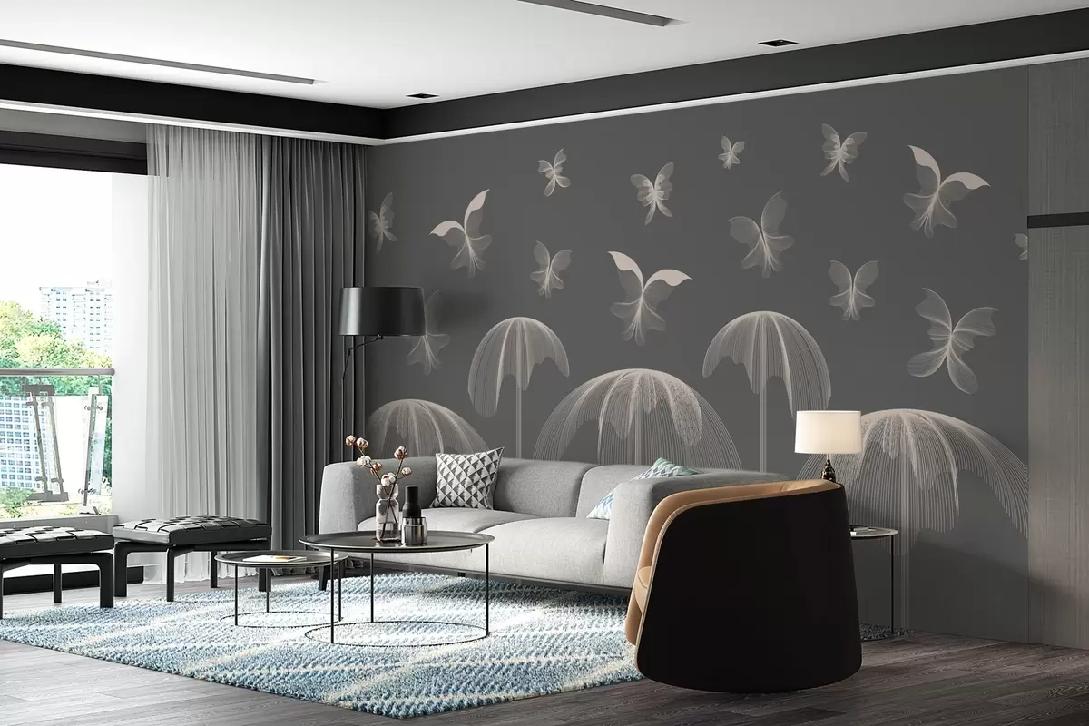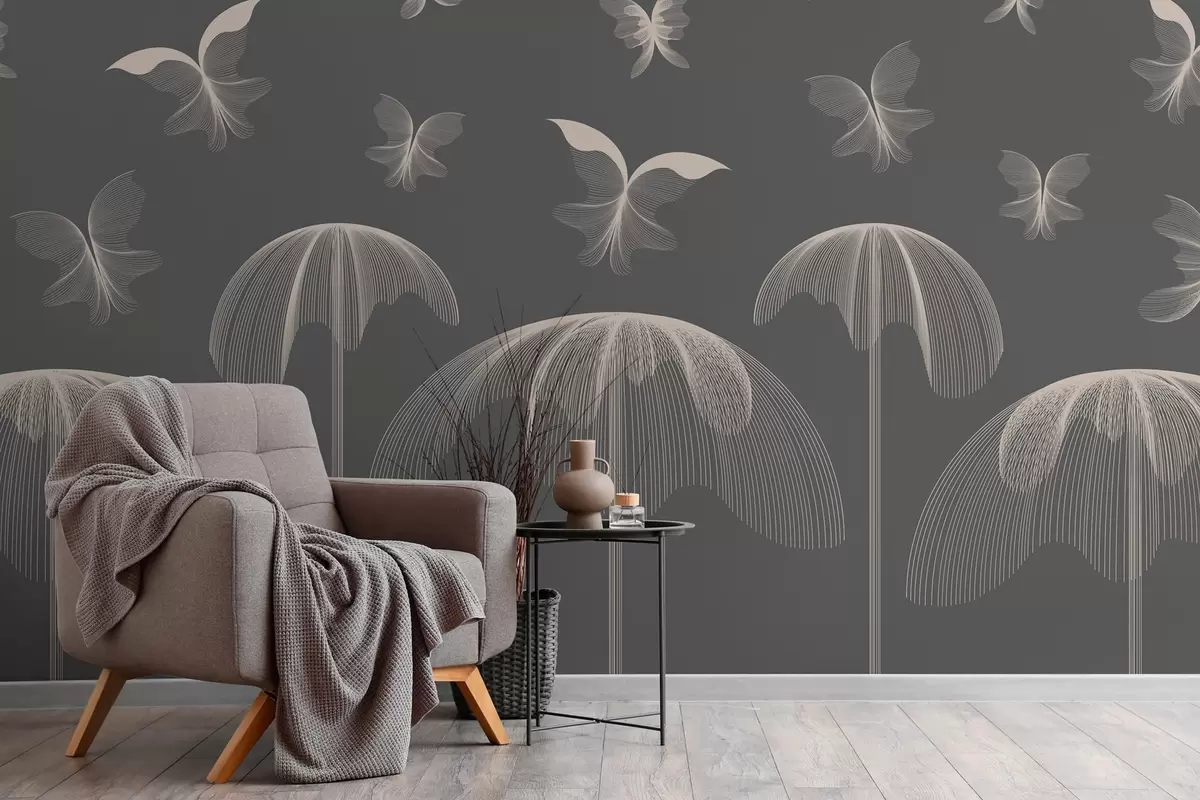 Fototapet tapet liniar minimalist fluturi și fântâni pe un fundal gri închis Nr. w03762v1