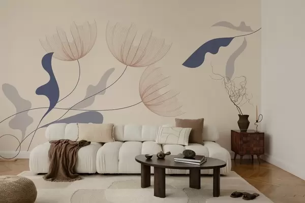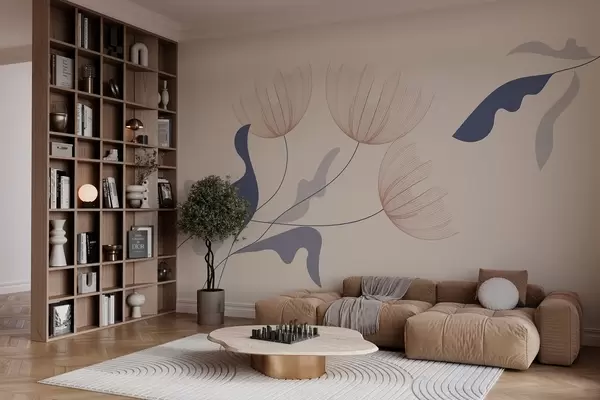 Fototapet flori elegante minimaliste în tonuri de albastru pe un fundal bej Nr. w03763