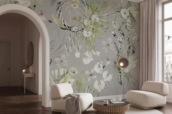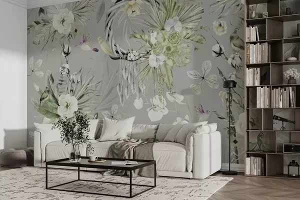 Fototapet Ornament în stil boho cu flori de bujor și păsări, stil acuarelă, culori verzi Nr. w03885v2