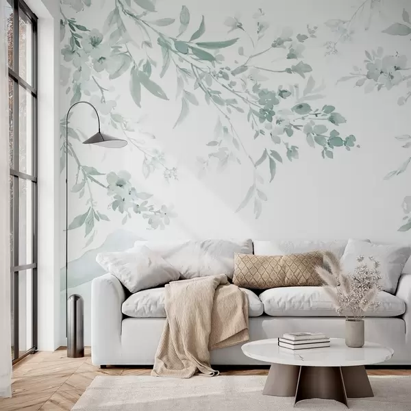 Fototapet Ramuri înflorite, imitație de acuarelă, nuanțe de verde Nr. w03935v3