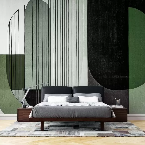 Fototapet compoziție geometrică abstractă modernă cu forme suprapuse și modele de linii verticale, linii subțiri care umplu trapezoide și ovale, suprapunere de textură textilă moale, tonuri calde, cum ar fi verde măslin, taupe, bej și cărbune, efecte subtile de transparență între forme Nr. w03937v3