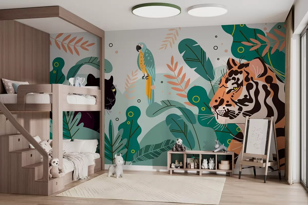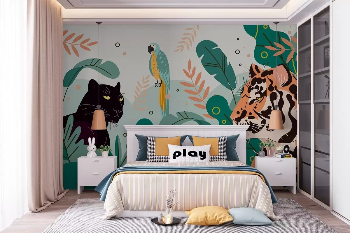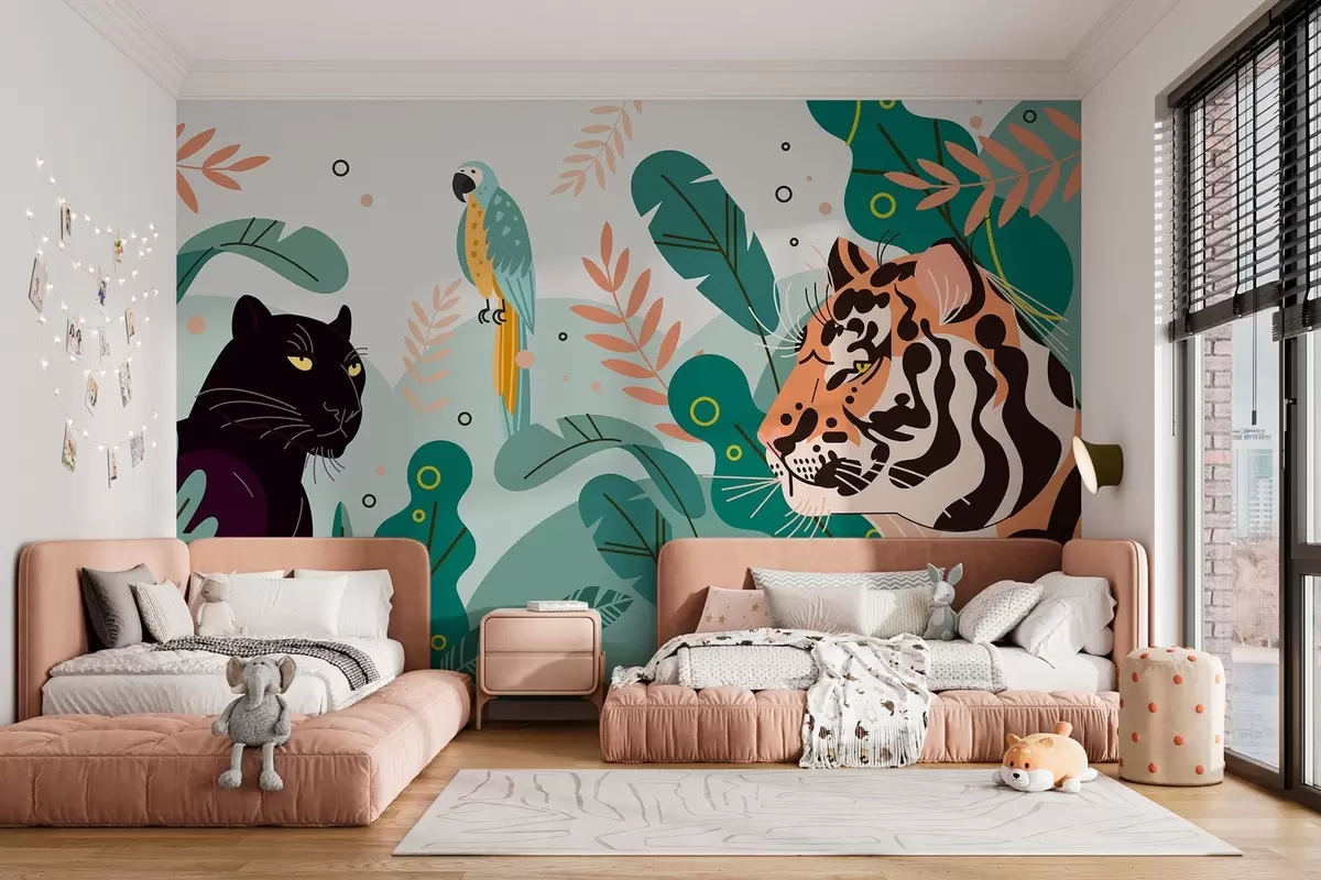 Fototapet junglă cu un tigru, o panteră și un papagal Nr. w03958