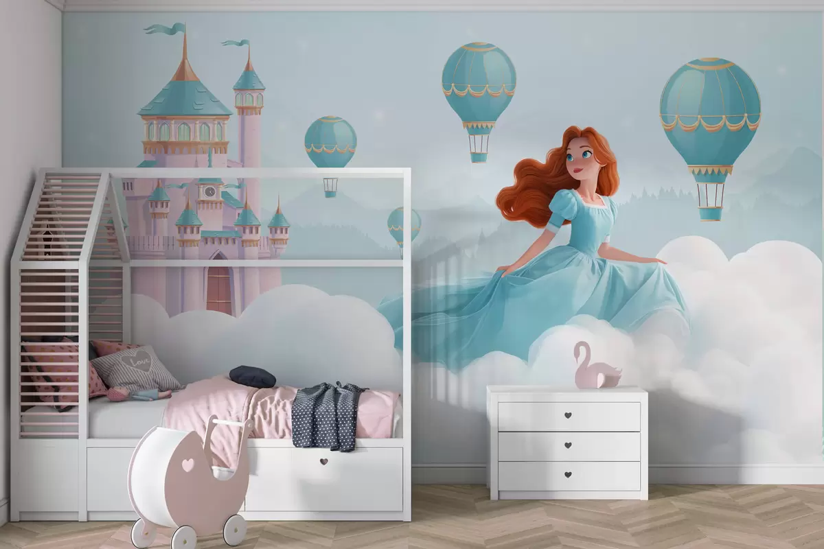 Fototapet Prințesa printre nori pe fundalul peisajului cu castelul Nr. w04015