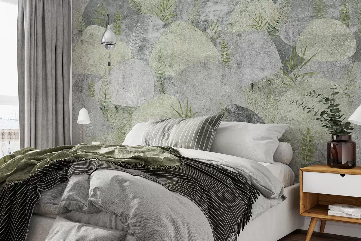 Fototapet Pietre cu plante, ferigă, nordic, stil rustic, culori gri și verde Nr. w04064v2