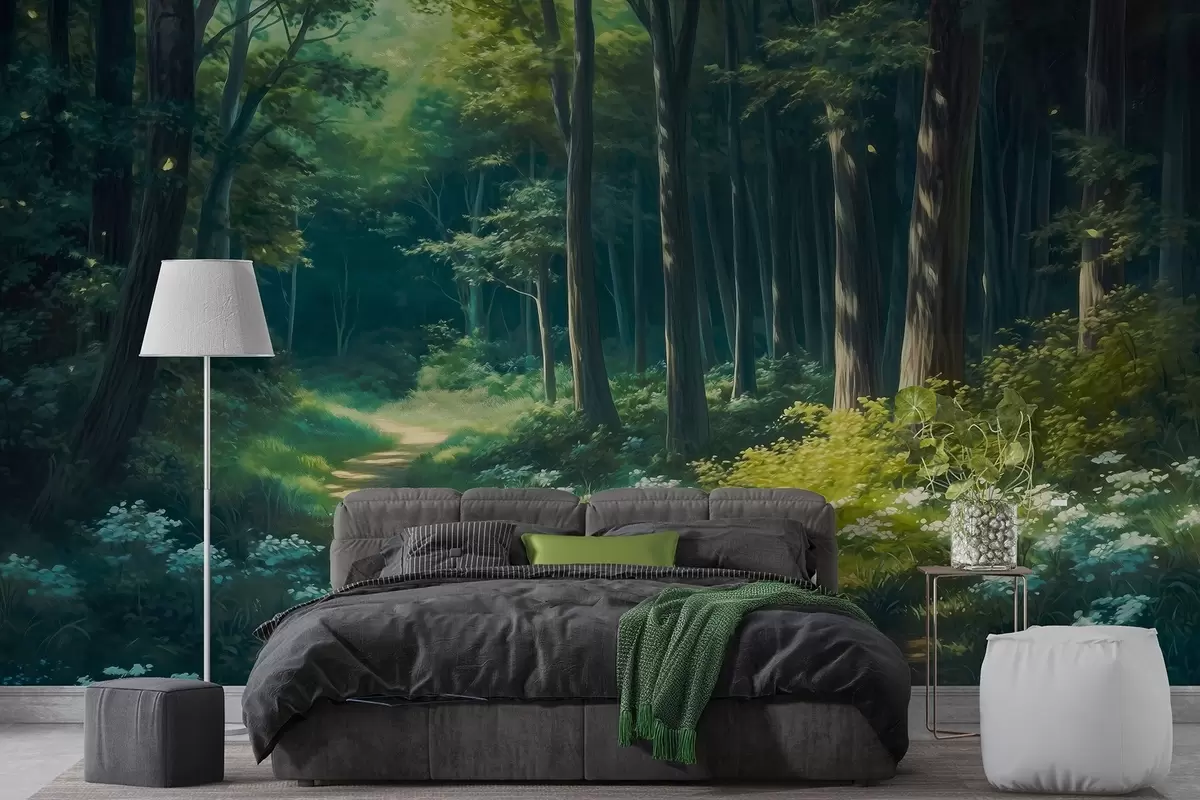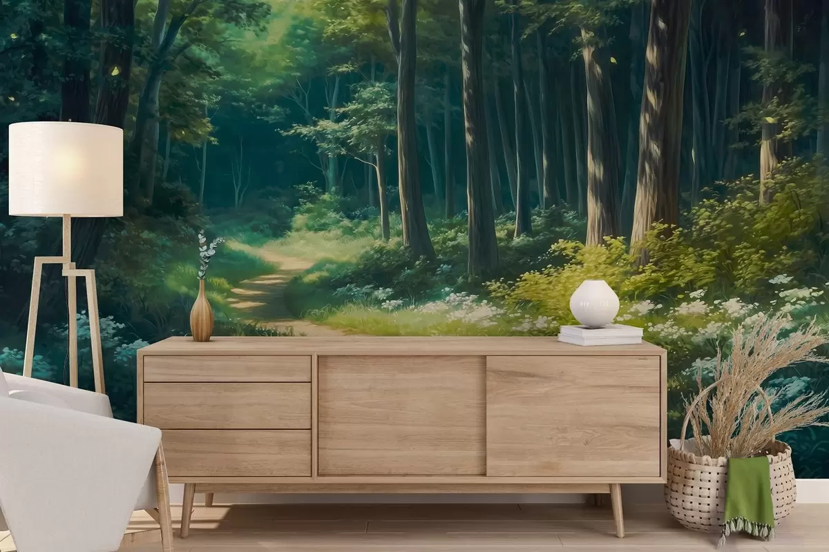 Fototapet Pădure verde cu lumina blândă a soarelui, copaci și flori albe, desen în stil ulei Nr. w04118