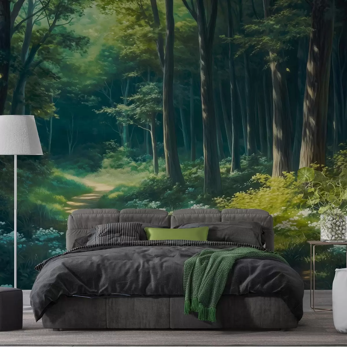 Fototapet Pădure verde cu lumina blândă a soarelui, copaci și flori albe, desen în stil ulei Nr. w04118