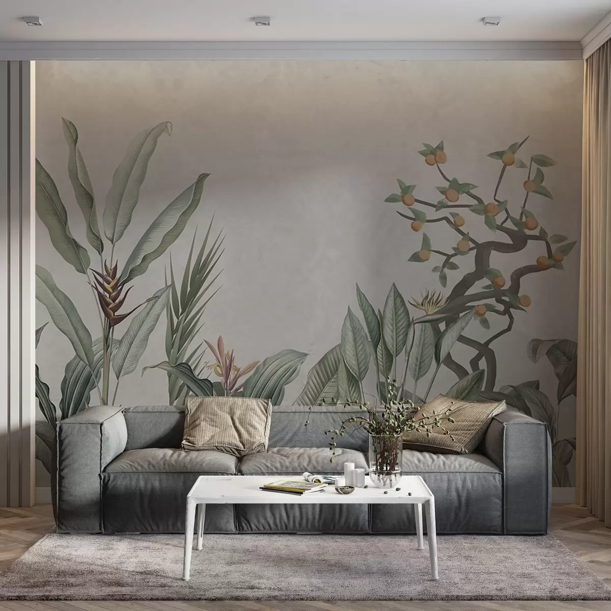 Fototapet Compoziție tropicală cu plante și copac pe un fundal gri Nr. w04201v1