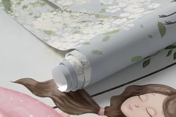 Fototapet Fata pe leagăn sub copac înflorit cu păsări care zboară în jur Nr. w04370