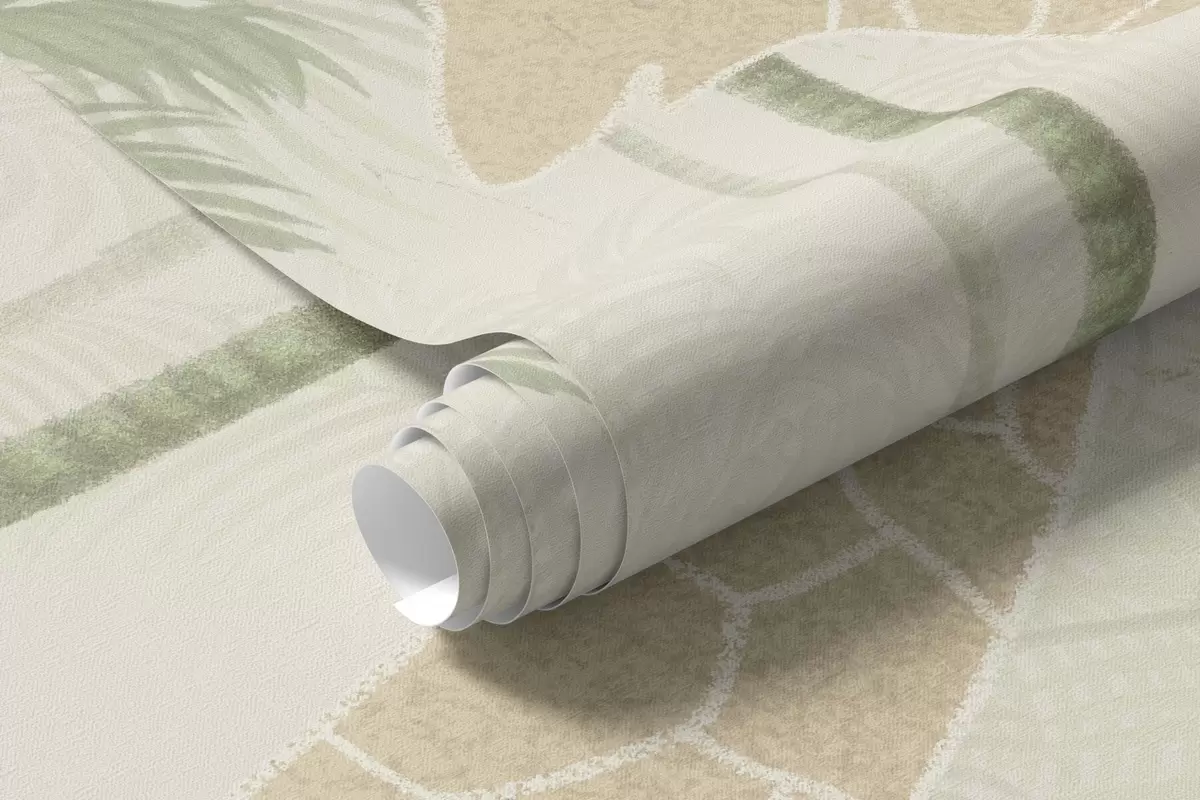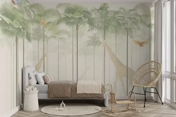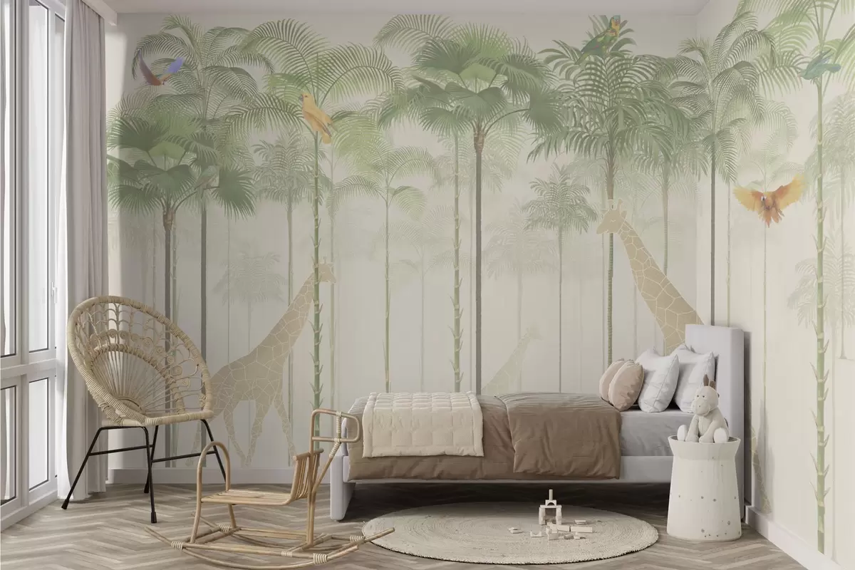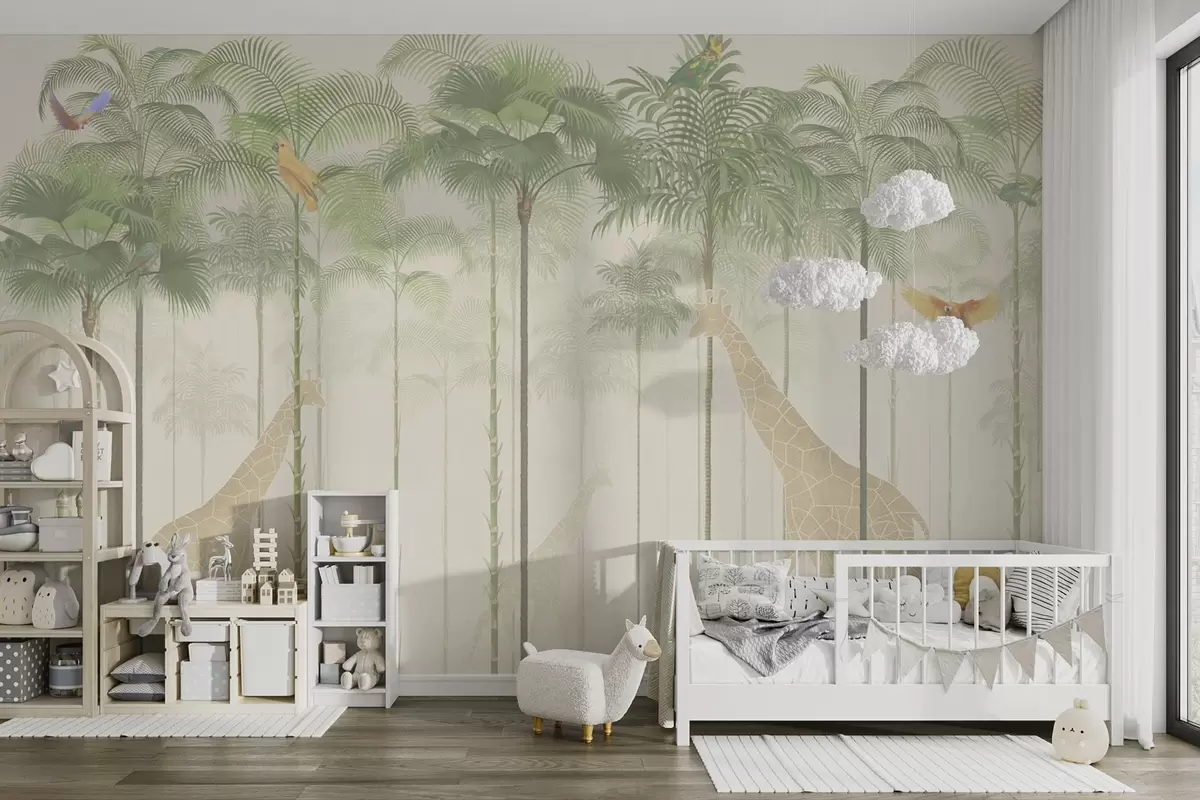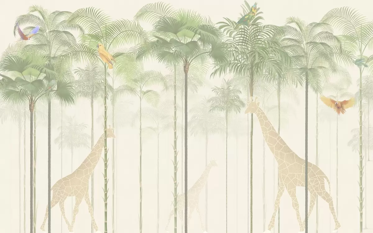 Fototapet Girafe și păsări tropicale printre palmieri înalți Nr. w04400