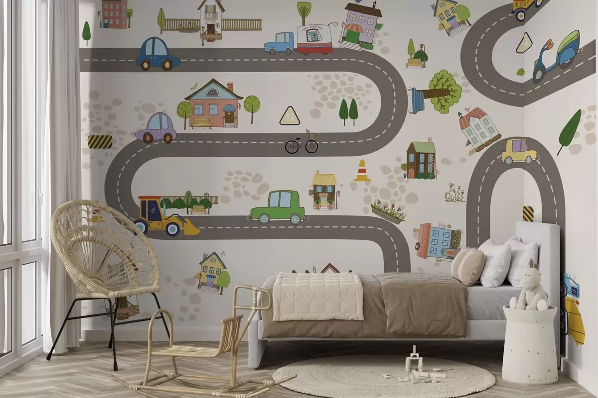 Fototapet Drum pentru copii cu mașini și case colorate Nr. w04404