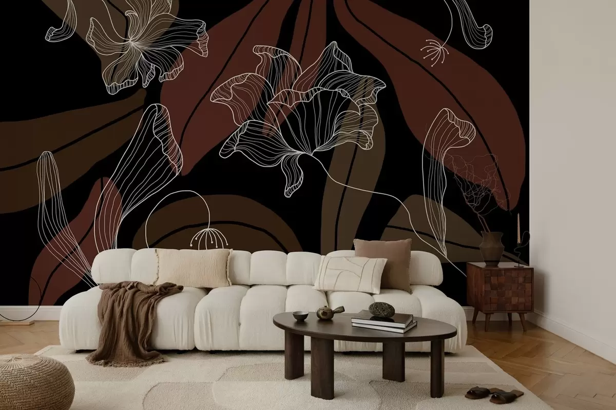 Fototapet frunze și flori abstracte în tonuri pudrate și bej pe un fundal întunecat Nr. w04499v3