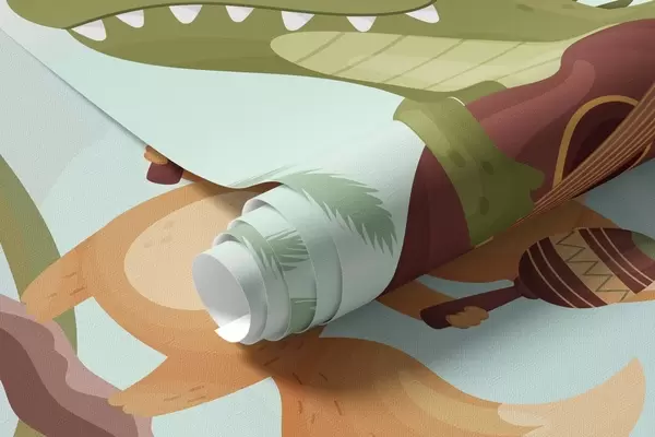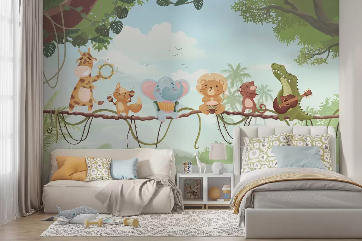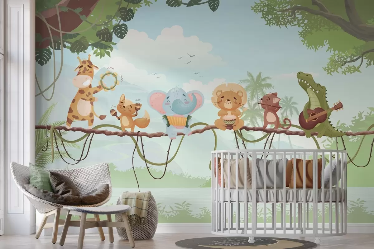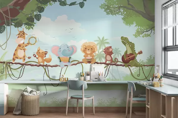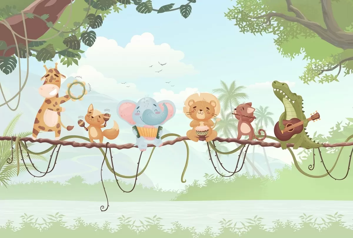 Fototapet Animale cu instrumente muzicale pe fundalul unui peisaj tropical Nr. w04505