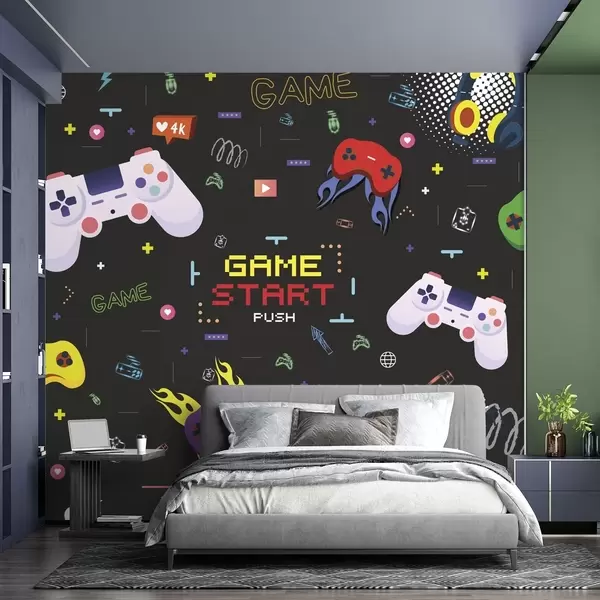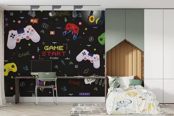Fototapet Model luminos pentru gameri, cu console și text pixelat Nr. w04581