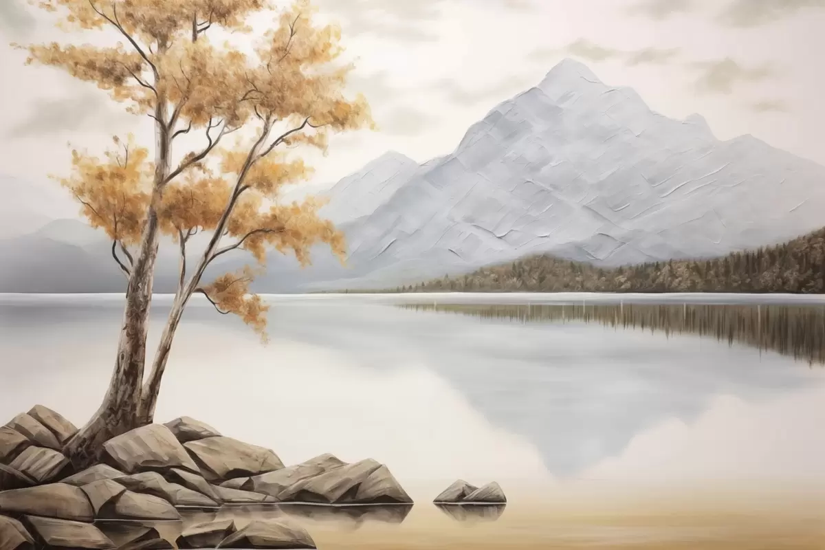 Fototapet Copac de toamnă lângă un lac de munte, culori pastelate calme Nr. w04611