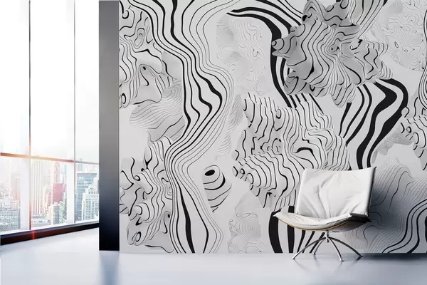 Fototapet forme organice abstracte în stil 3D în tonuri de alb și gri cu dungi negre Nr. w04627