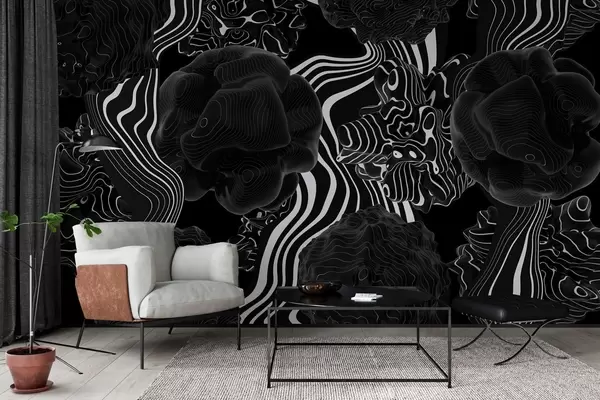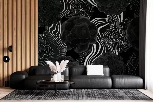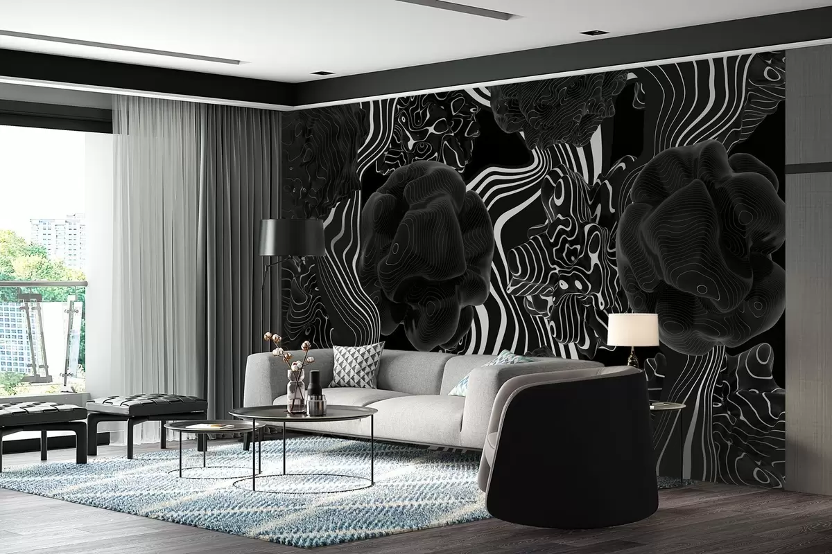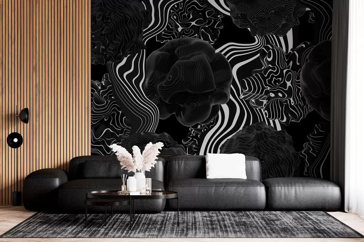 Fototapet forme organice abstracte în stil 3D în tonuri de negru cu dungi albe Nr. w04628