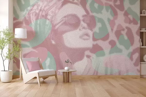 Fototapet portretul unei femei pe un fundal cu leopard, în stil punctat, în tonuri de roz și verde Nr. w04630v2
