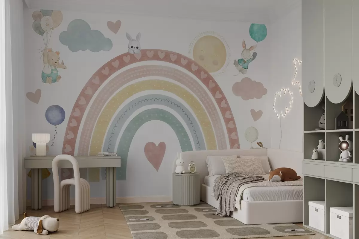 Fototapet Curcubeu pastelat cu inimi, animale și baloane Nr. w04681