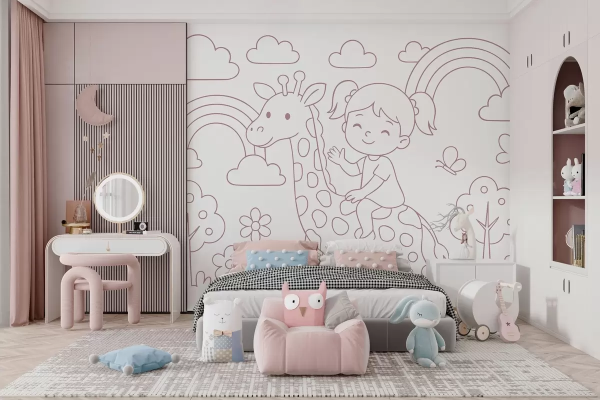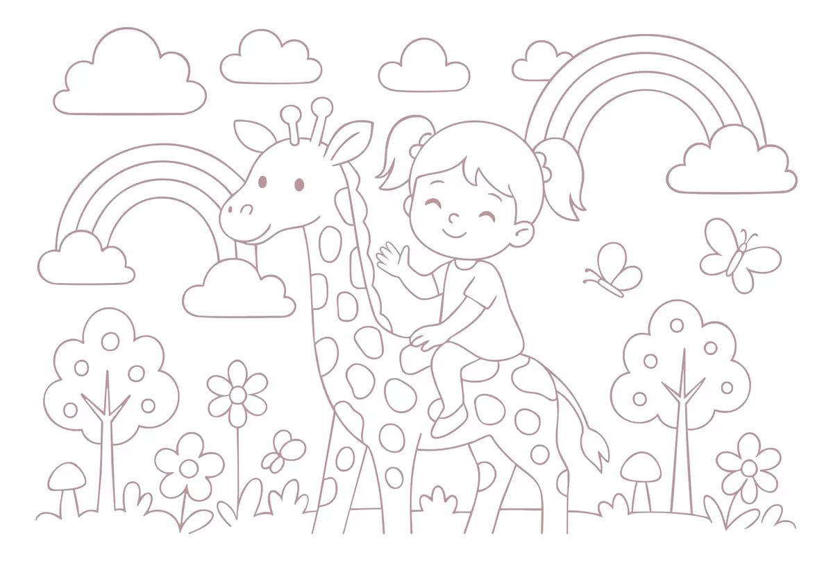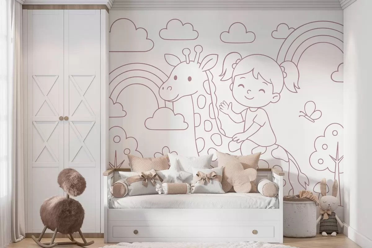 Fototapet pictură în pulbere a unei fete pe o girafă în stilul unei cărți de colorat pentru copii Nr. w04753v1