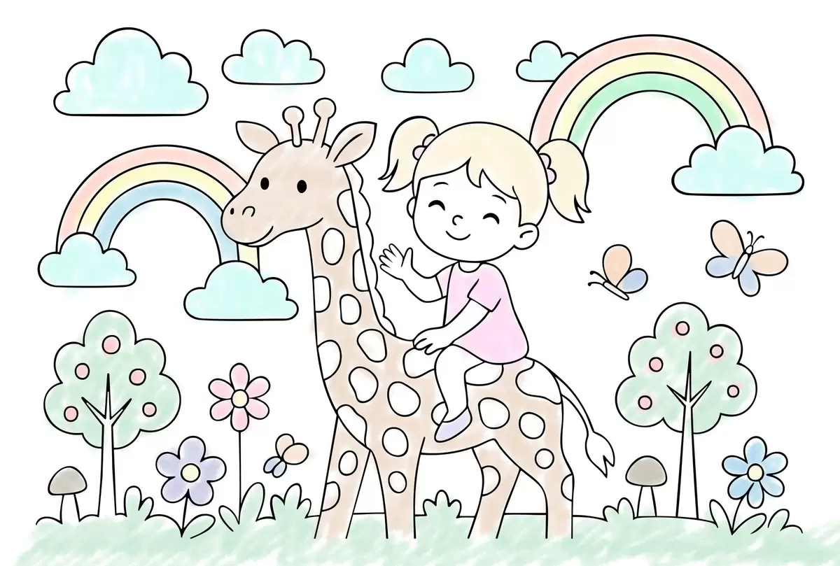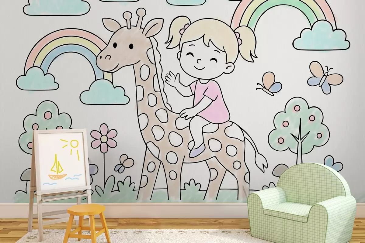 Fototapet fată pe o girafă în stilul unei cărți de colorat pentru copii Nr. w04755