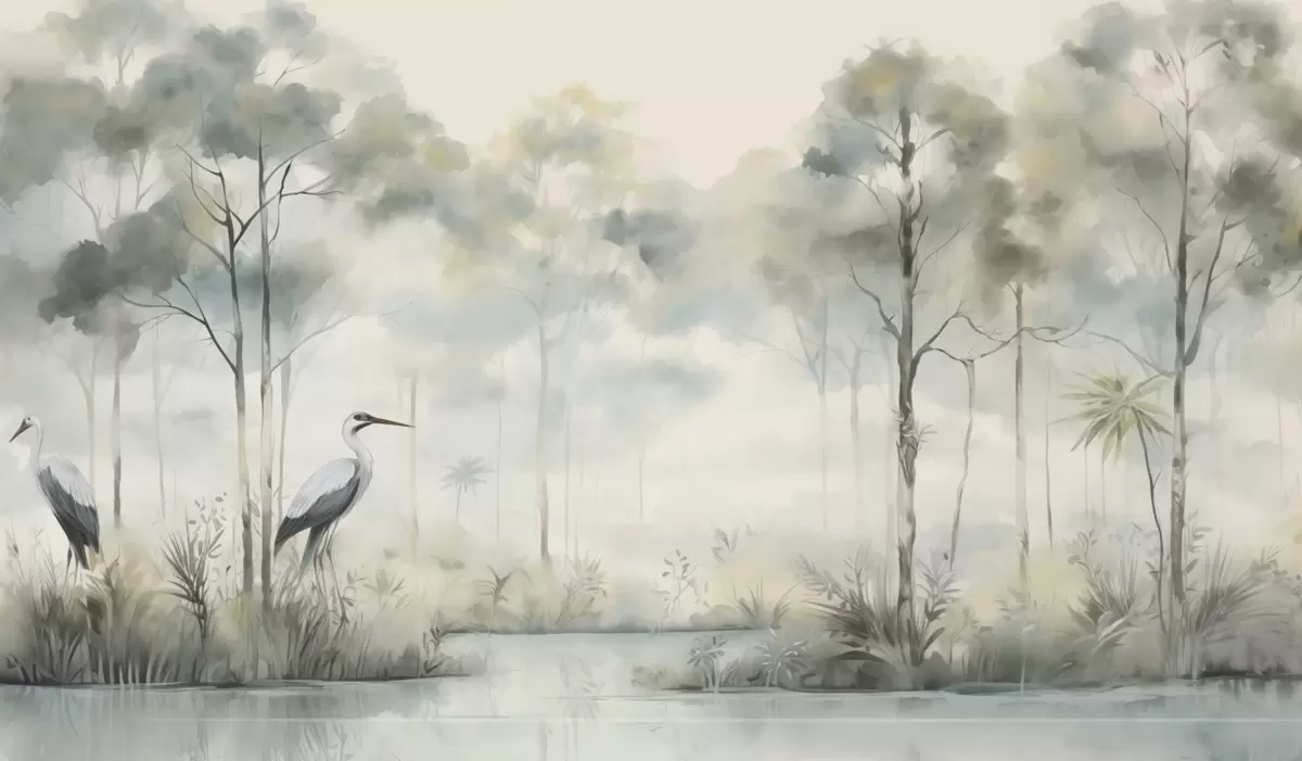 Fototapet Pădure ceațoasă lângă apă, cu stârci, paletă de culori calde și delicate Nr. w04788
