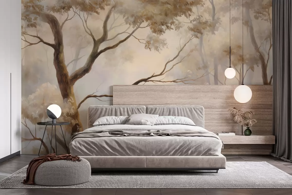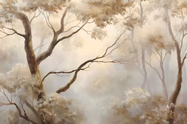 Fototapet Pădurea în ceața ușoară a dimineții. O pictură delicată, atmosferică, în stilul unui peisaj artistic. Nr. w04817
