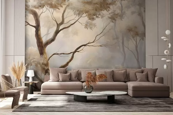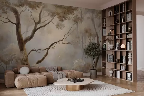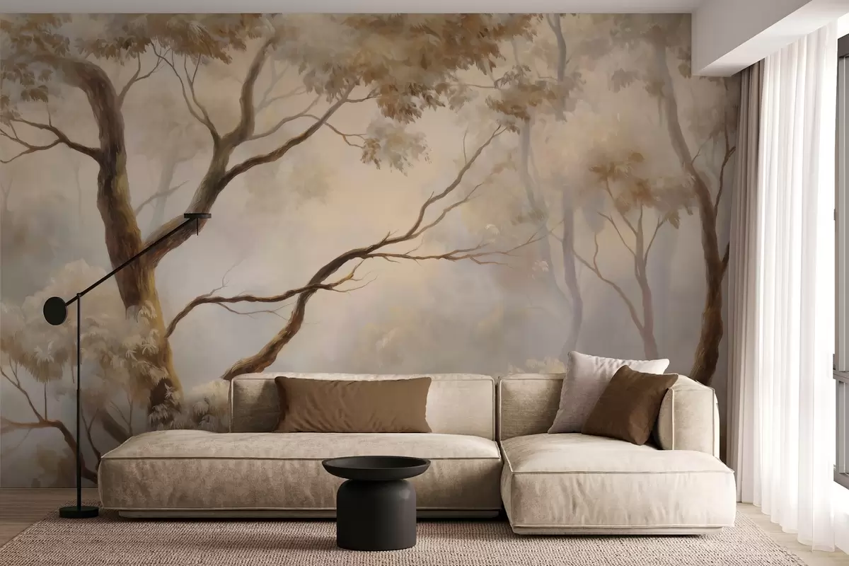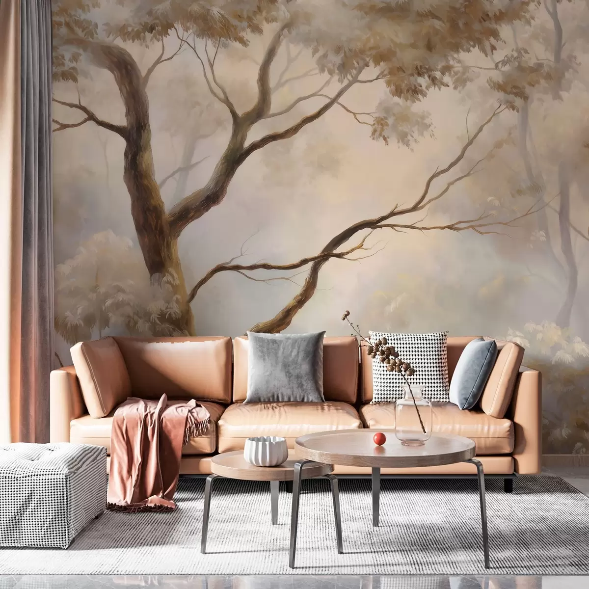 Fototapet Pădurea în ceața ușoară a dimineții. O pictură delicată, atmosferică, în stilul unui peisaj artistic. Nr. w04817