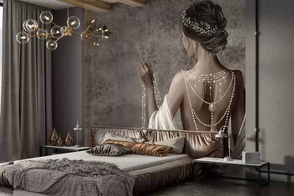 Fototapet Femeie văzută din spate cu perle, fundal cu model de piatră gri Nr. w04854