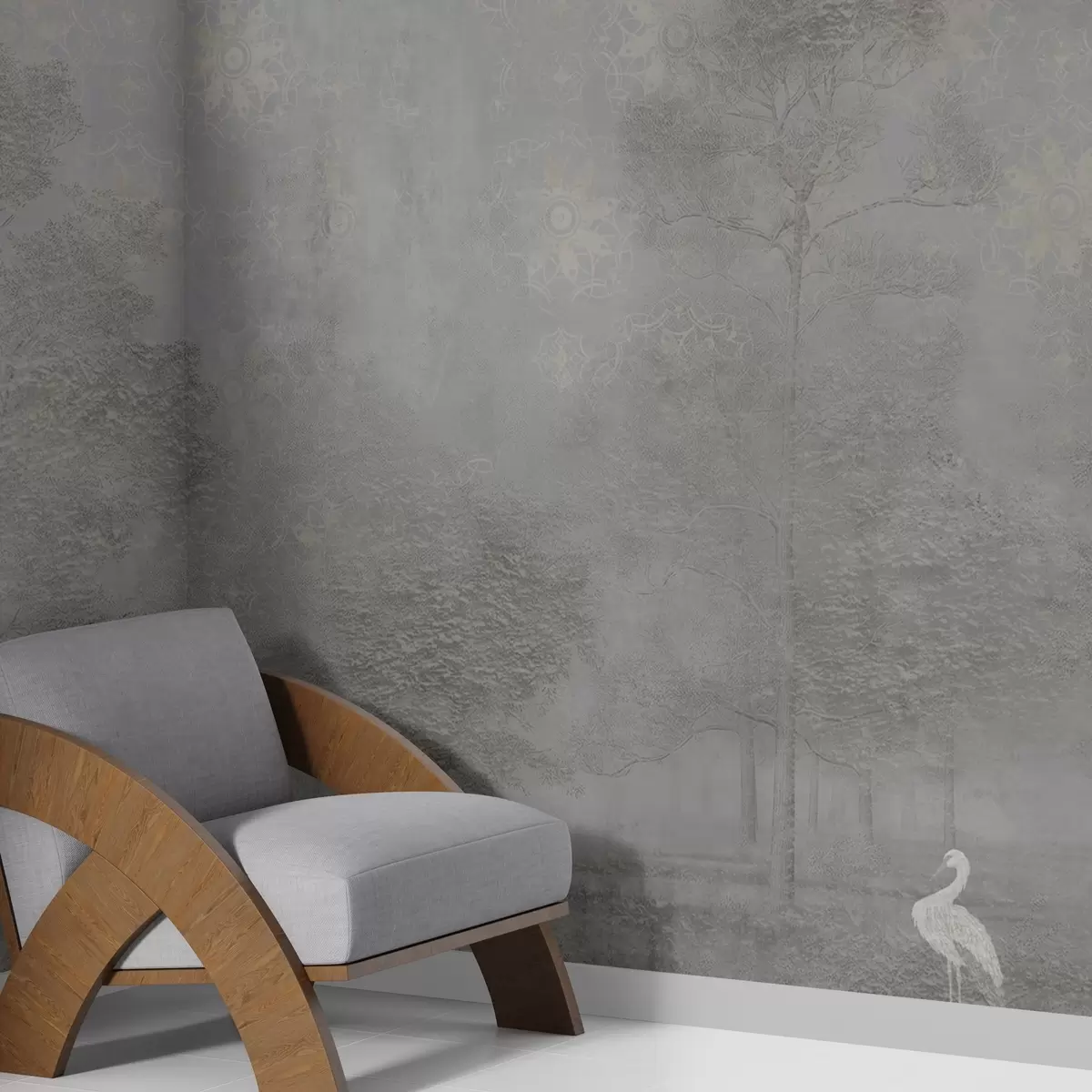 Fototapet Pădure ușor încețoșată cu o stârcă în tonuri reci de gri Nr. w04953v2
