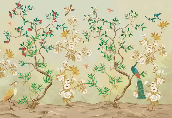 Fototapet Scena decorativă cu copaci, flori și păsări pe fundal întunecat Nr. w05004