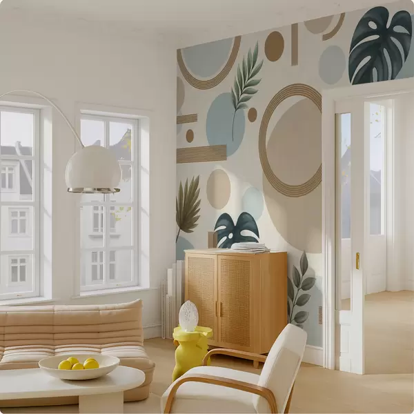 Fototapet Model geometric cu frunze și cercuri în tonuri calme Nr. w05018