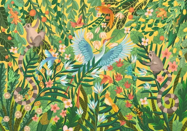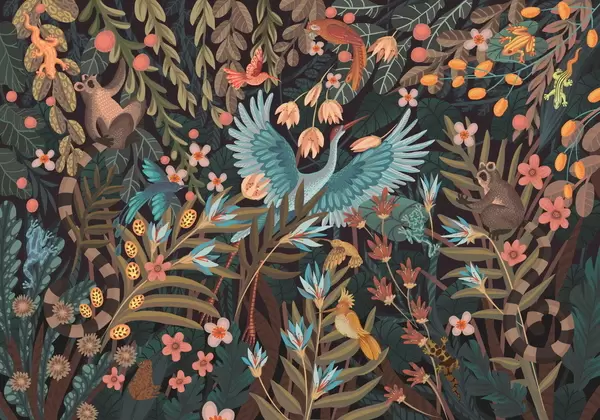 Fototapet Scena fantastică cu păsări și animale printre plante Nr. w05024