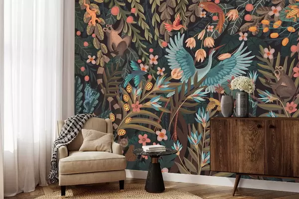 Fototapet Scena fantastică cu păsări și animale printre plante Nr. w05024