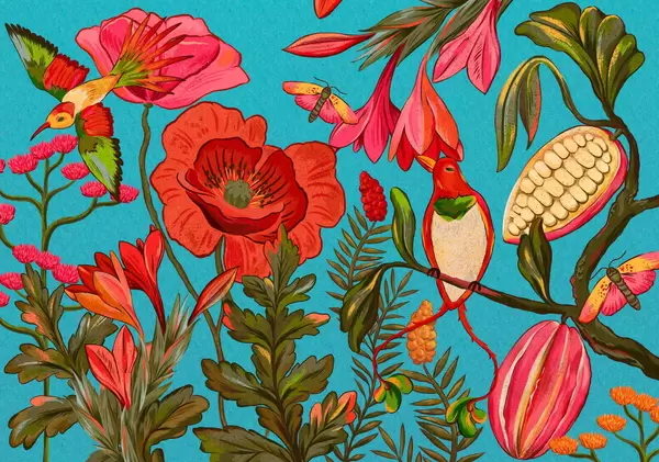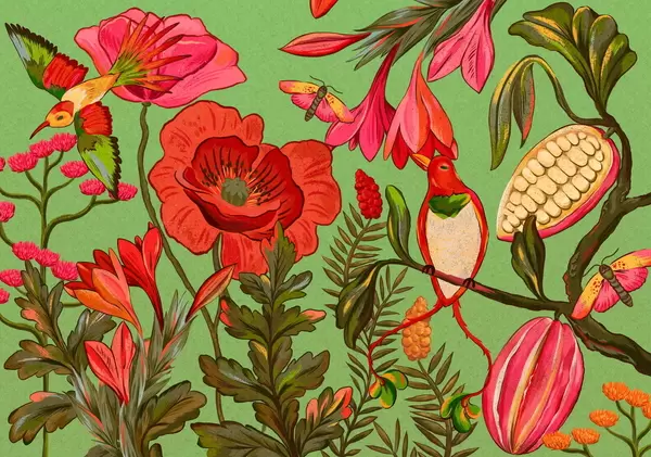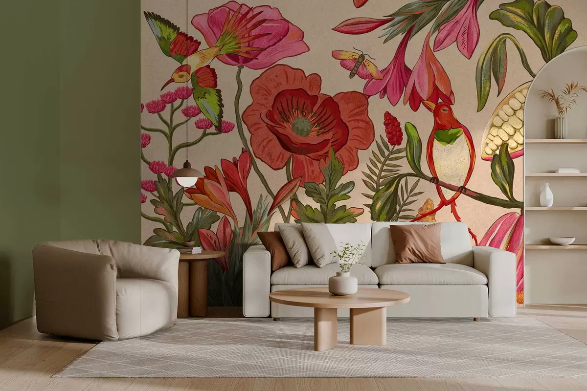 Fototapet Flori decorative și păsări pe fundal bej Nr. w05036