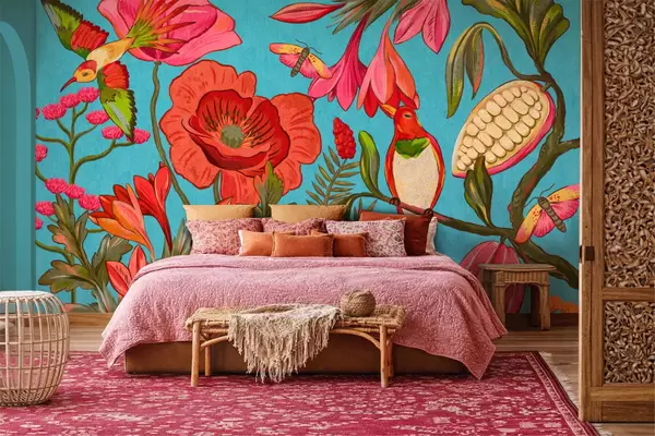 Fototapet Flori decorative și păsări pe fundal albastru Nr. w05036v3