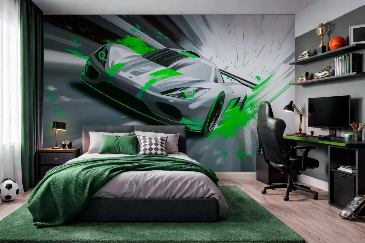 Fototapet mașină sport dinamică în stil de desen digital cu accente verzi Nr. w05069v4