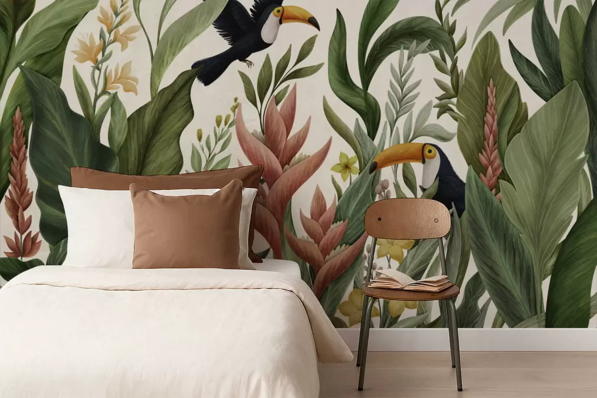 Fototapet Plante tropicale și păsări cu cioc mare pe fundal deschis Nr. w05088v1