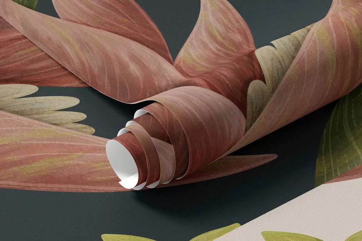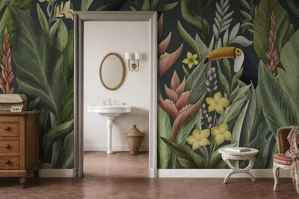 Fototapet Plante tropicale și păsări cu cioc mare pe fundal întunecat Nr. w05088v2