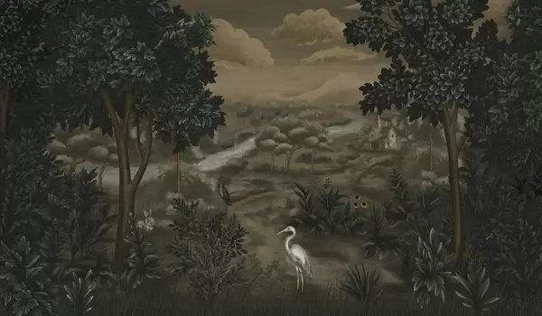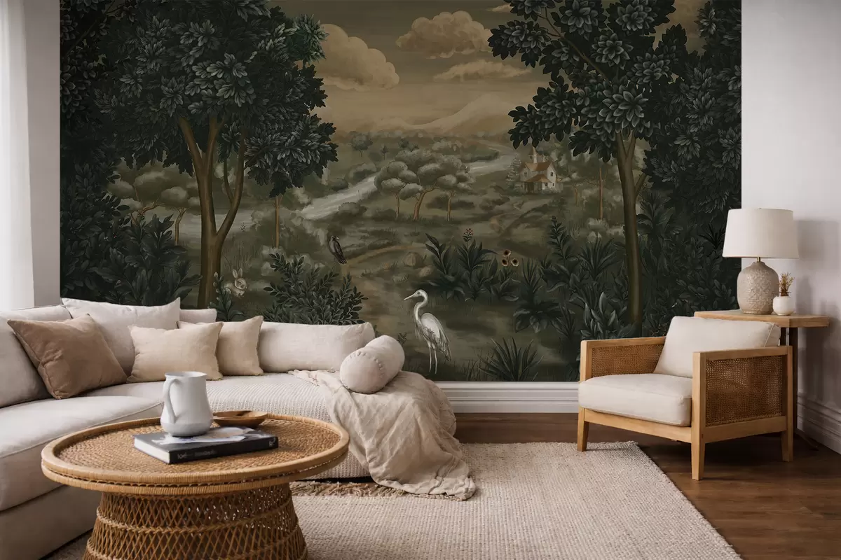 Fototapet Peisaj fantastic cu râu, casă și păsări printre copaci Nr. w05090