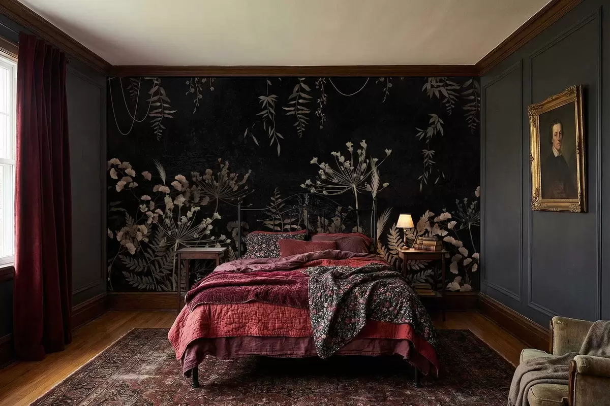 Fototapet Model botanic întunecat cu flori și frunze Nr. w05092